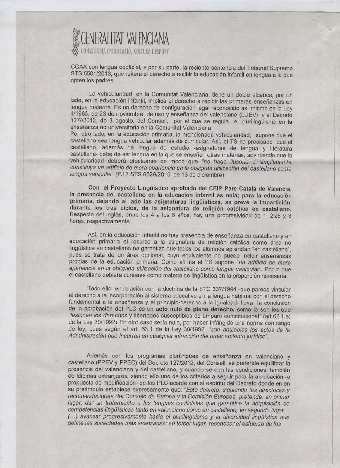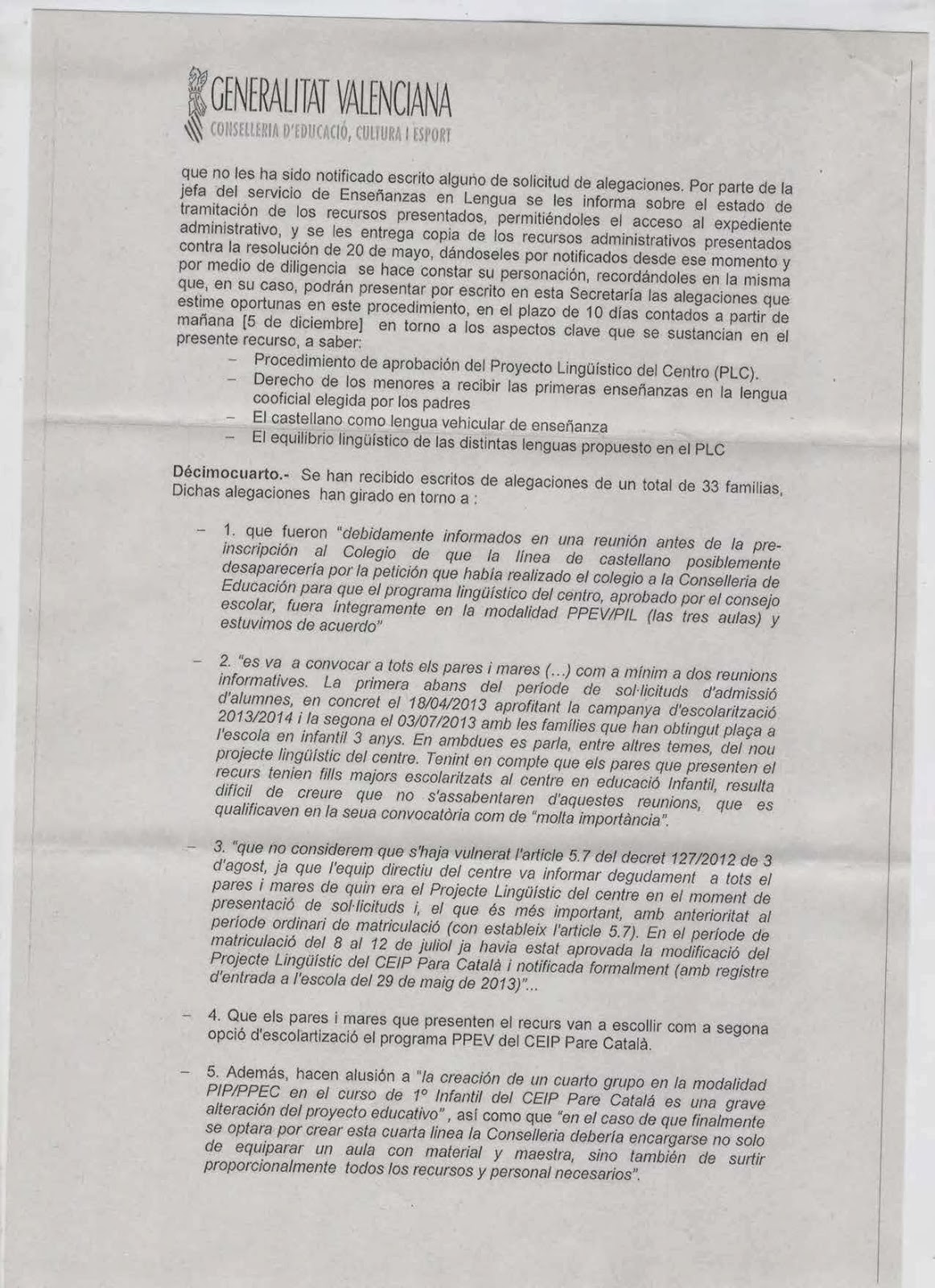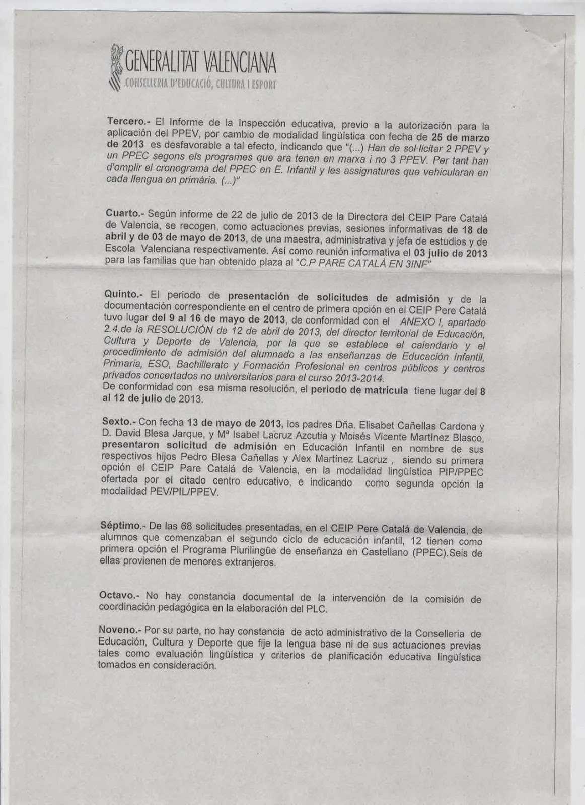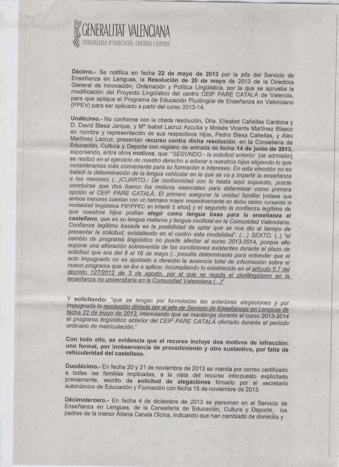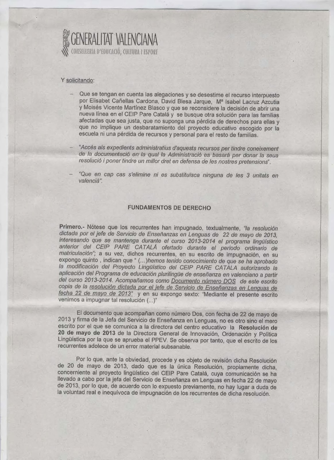 1.- Que el grup A d’Infantil 3 anys, que ha començat el curs aplicant el programa lingüístic esmentat, haja de canviar ara a un programa en castellà. Aquest fet atempta contra la voluntat majoritària de les famílies del grup que van matricular els seus fills i filles en valencià i volen que siga aquest projecte lingüístic el que es continue desenvolupant en el seu grup.