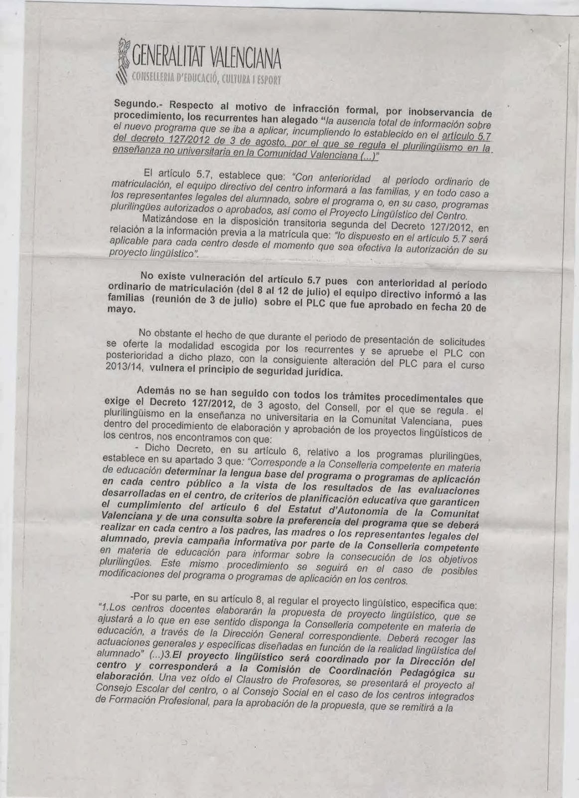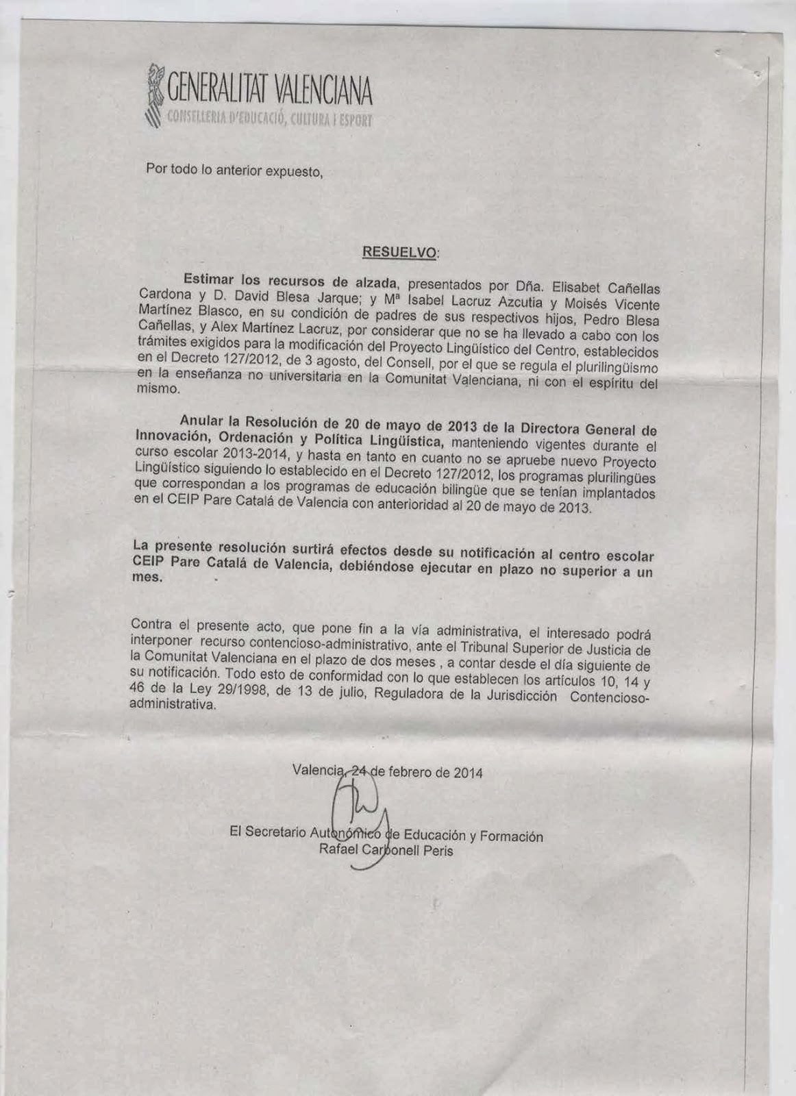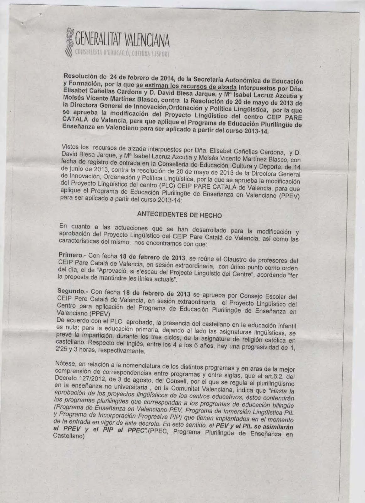 Aquesta Resolució suposa tornar a donar vigència als programes d’educació bilingüe que estaven implantats a l’escola fins al curs passat. Aquesta decisió, que anul·la una Resolució anterior que autoritzava la proposta del Consell Escolar del centre perquè a partir d’aquest curs les tres línies de l’escola aplicaren un Programa d’Educació Plurilingüe en Valencià, provocarà: