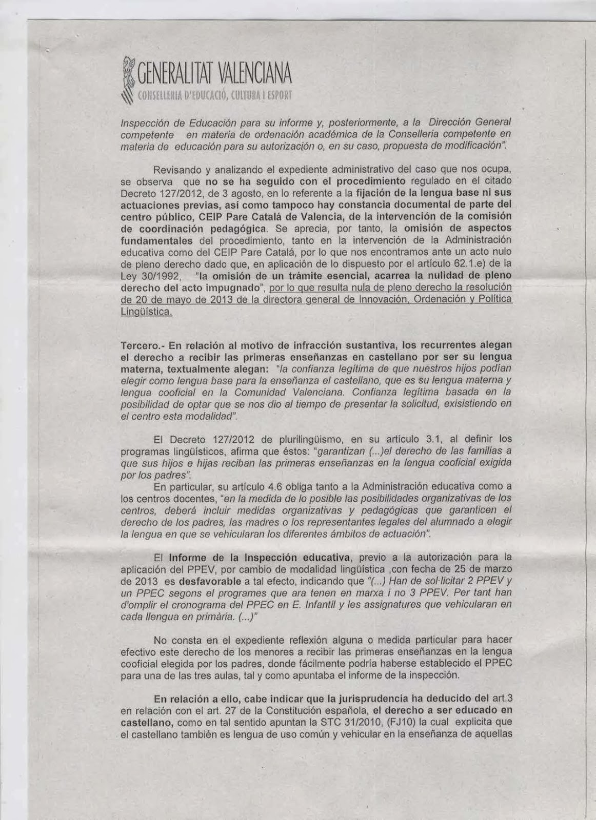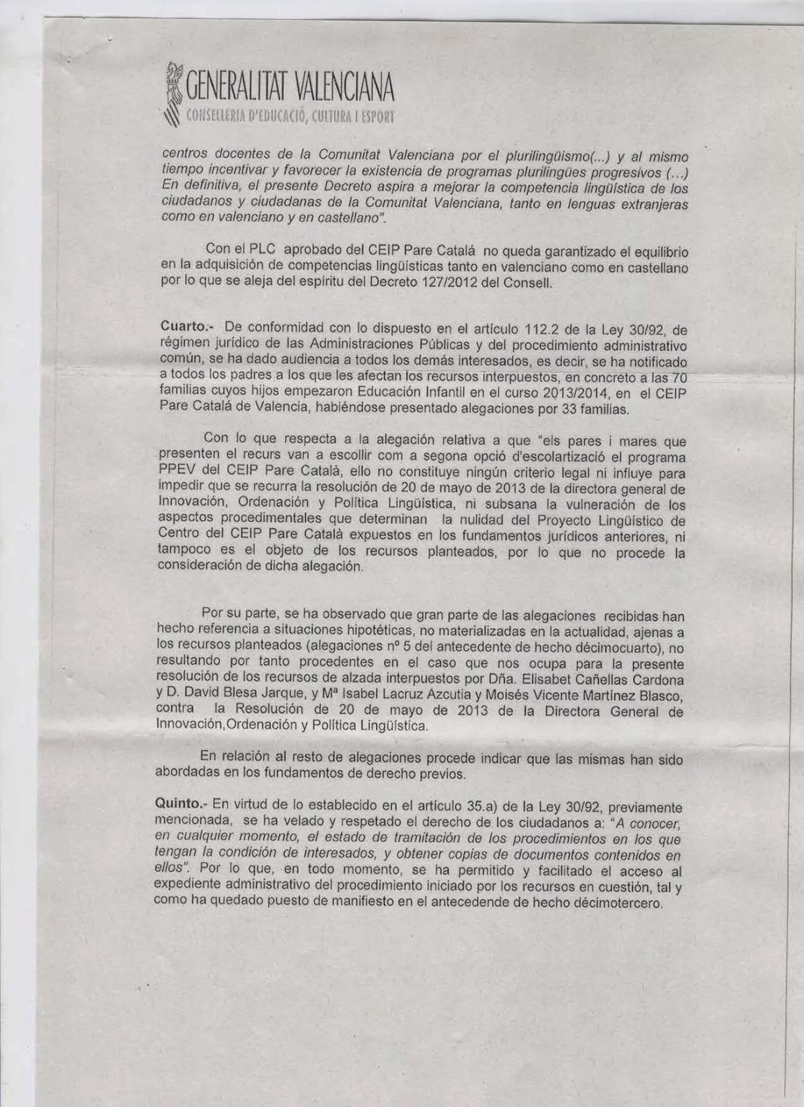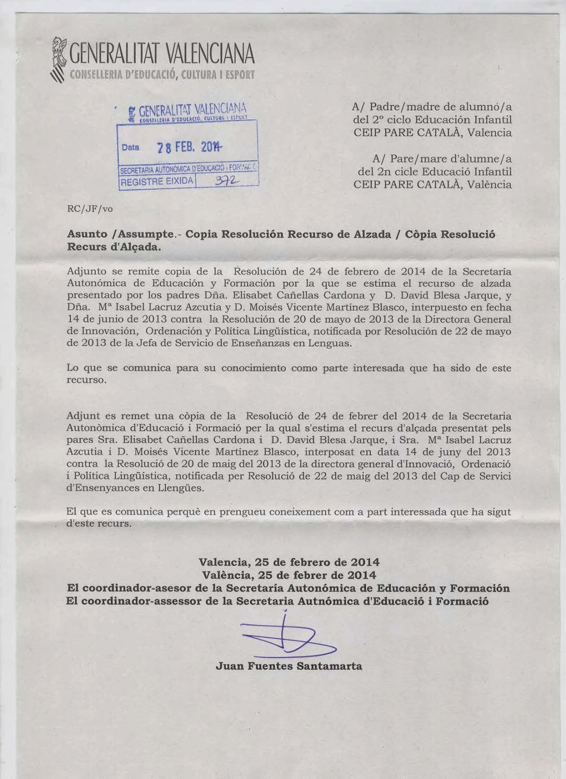Aquesta Resolució suposa tornar a donar vigència als programes d’educació bilingüe que estaven implantats a l’escola fins al curs passat. Aquesta decisió, que anul·la una Resolució anterior que autoritzava la proposta del Consell Escolar del centre perquè a partir d’aquest curs les tres línies de l’escola aplicaren un Programa d’Educació Plurilingüe en Valencià, provocarà: