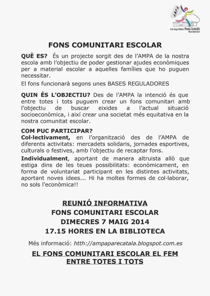 FONS COMUNITARI ESCOLAR 6 Mai, 201423 Octubre, 2015 / AFA Pare Català Benimaclet, a 6 de maig de 2014L’AMPA de l’escola informa REUNIÓ INFORMATIVA FONS COMUNITARI ESCOLAR DIMECRES 7 MAIG 2014 17.15 HORES EN LA BIBLIOTECA Comparte: Feu clic per compartir a X (S'obre en una nova finestra) X Feu clic per compartir al Facebook (S'obre en una nova finestra) Facebook M'agrada S'està carregant...