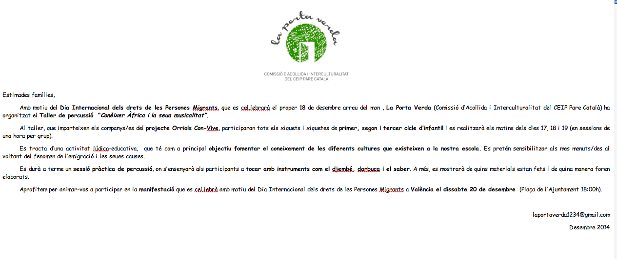 Amb motiu del Dia Internacional dels drets de les Persones Migrants, que es cel.lebrarà el proper 18 de desembre arreu del mon , La Porta Verda (Comissió d’Acollida i Interculturalitat del CEIP Pare Català) ha organitzat el Taller de percussió “Conèixer Àfrica i la seua musicalitat”.