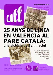 La Universitat Lliure de Benimaclet convoca per al dijous 5 de febrer a les 19:30, a la seu del Centre Instructiu Musical de Benimaclet (El Musical), la taula redona “25 anys de línia en valencià al Pare Català: una victòria de Benimaclet”.