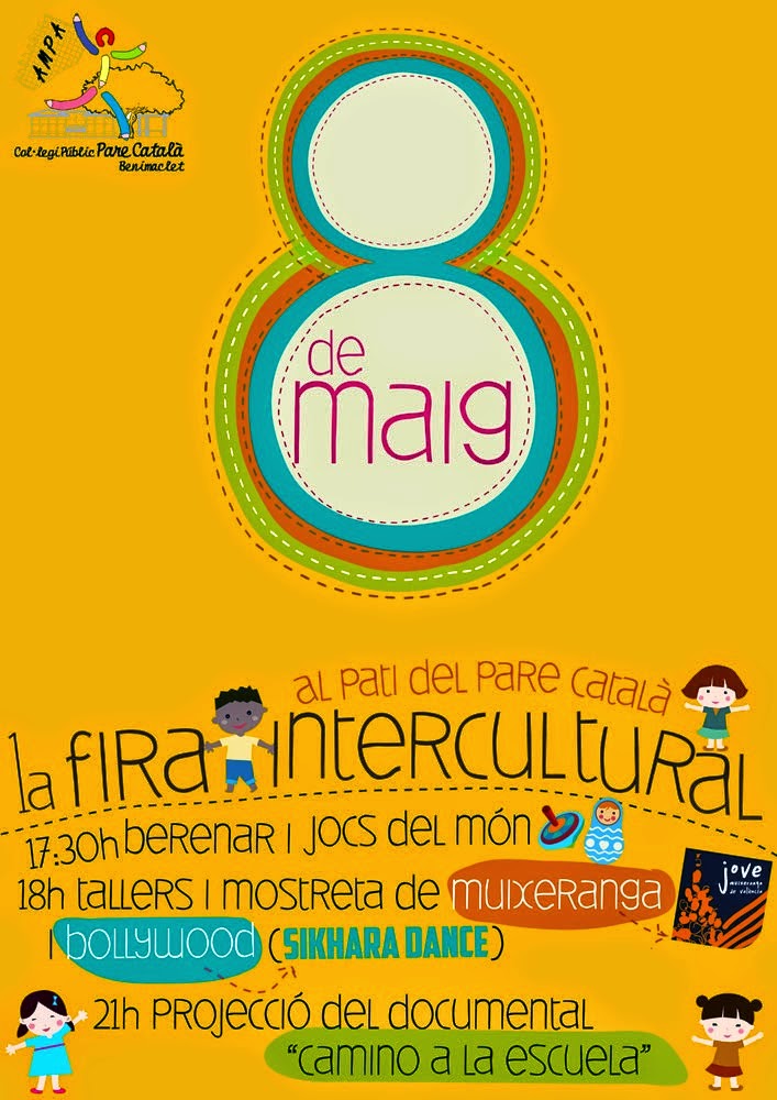 A partir de les 17:30 tindrem berenar solidari (a benefici del Fons Comunitari Escolar), Jocs Tradicionals d’Argentina, de Tailàndia i, com no, també valencians (no oblideu portar les vostres trompes !!!), Taller de Muixerangues, Taller Bollywood (Sikhara Dance), Danses tradicionals bolivianes (amb el grup MORENADA CENTRAL COCANIS VALENCIA).