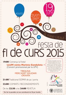 Aquest divendres 19 de juny, a partir de les 19 hores, tindrà lloc la Festa de Fi de Curs 2015. Enguany comptem amb la col·laboració de la UPV amb el concert LLUM contra Marieta Ganduleta.