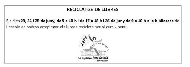 Reciclatge de Llibres al Pare Català 18 Juny, 201513 Novembre, 2015 / AFA Pare Català Els dies 23, 24 i 25 de juny, de 9 a 10 h i de 17 a 18 h i 26 de juny de 9 a 10 h a la biblioteca de l’escola es podran arreplegar els llibres reciclats per al curs vinent. Comparte: Feu clic per compartir a X (S'obre en una nova finestra) X Feu clic per compartir al Facebook (S'obre en una nova finestra) Facebook M'agrada S'està carregant...