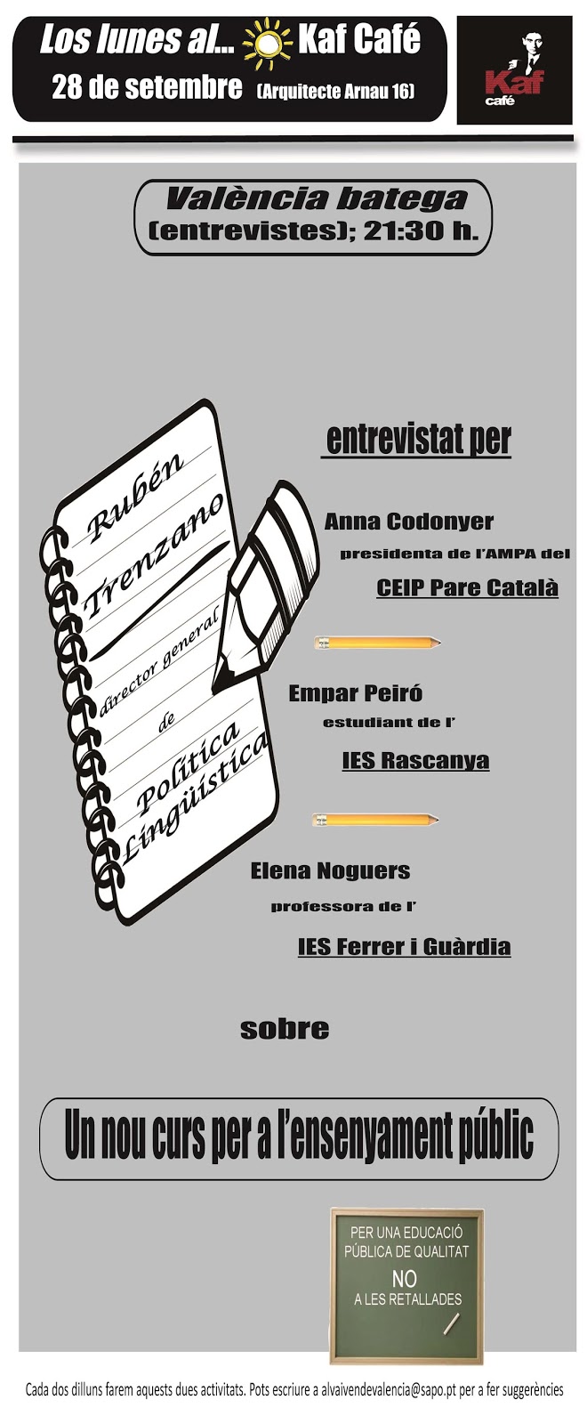 El programa d’entrevistes València batega dóna veu aquesta nit a Rubén Trenzano, veí d’aquest barri, membre de l’AMPA del CEIP Pare Català, i director general de Política Lingüística. Ell contestarà a les preguntes, opinions, suggerències, crítiques… al voltant del tema Un nou curs per a l’ensenyament públic.
