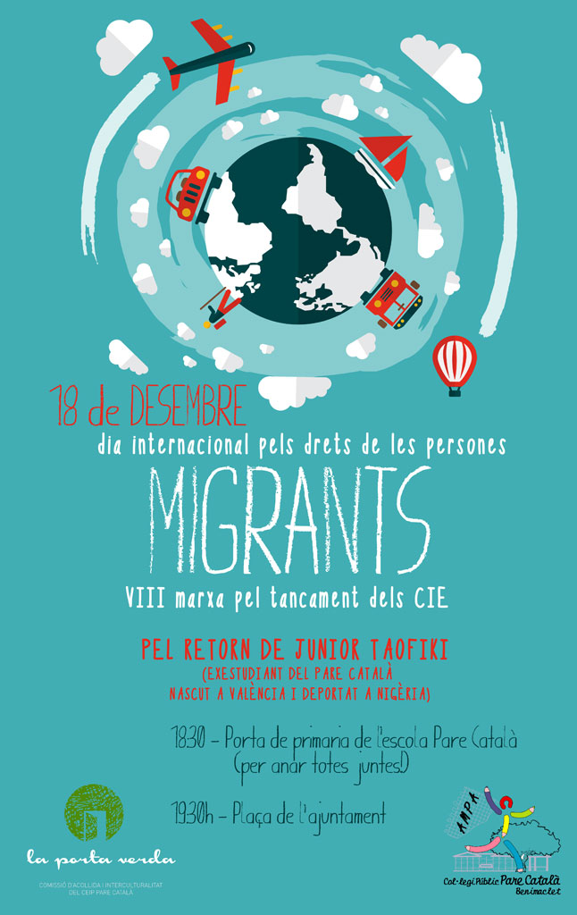 Aprofitant aquest acte, la comissió d’interculturalitat La Porta Verda volem convidar-te a unir-te a nosaltres (una hora abans a la porta de l’escola) per marxar junts pels drets de les persones migrants i, concretament, pel retorn de Junior Taofiki. Antic alumne de l’escola Pare Català, que haguen nascut a València i no havent viscut mai a Nigèria, ha estat deportat -fa cosa d’un any- al país d’origen dels seus pares. Volem marxar doncs, per demanar la seua regularització immediata i el retorn al seu país d’origen (el nostre).