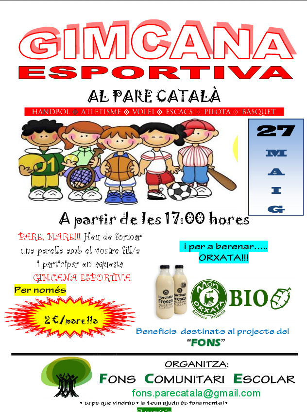 Des del FONS COMUNITARI ESCOLAR vos convidem a participar en la GIMCANA ESPORTIVA SOLIDÀRIA el pròxim divendres 27 de Maig a les 17 hores al pati de primària.