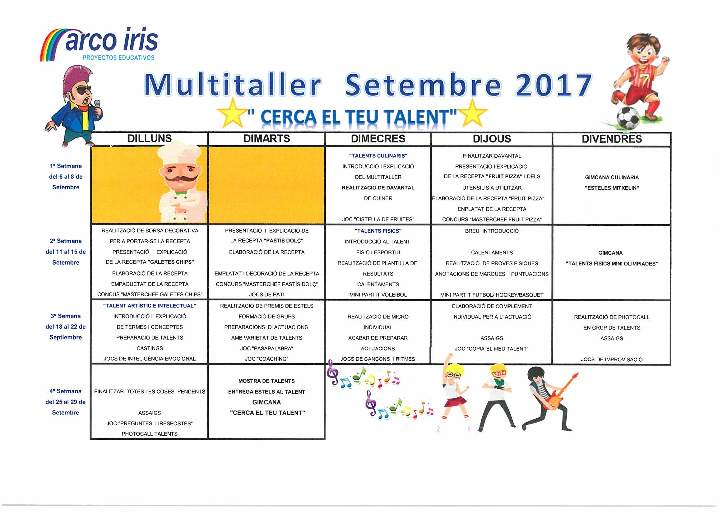 Durant el mes de Juny hem preparat “l’Escola de detectius” en la qual ens encarregarem de formar professionals de la recerca, desxifrant enigmes i successos misteriosos. Un bon detectiu necessita una habilitat especial, molt ensinistrament i imaginació. Per tot aco, ens ha semblat un tema atractiu i divertit en el qual els alumnes gaudiran realitzant tallers manuals, dinàmiques i jocs específics sobre el tema. Per al mes de Setembre el nostre projecte ho hem titulat “Cerca el teu talent” i amb el volem que l’alumnat ho passe genial amb els seus companys/as i mostren el seu talent en les diferents disciplines en les quals treballarem.