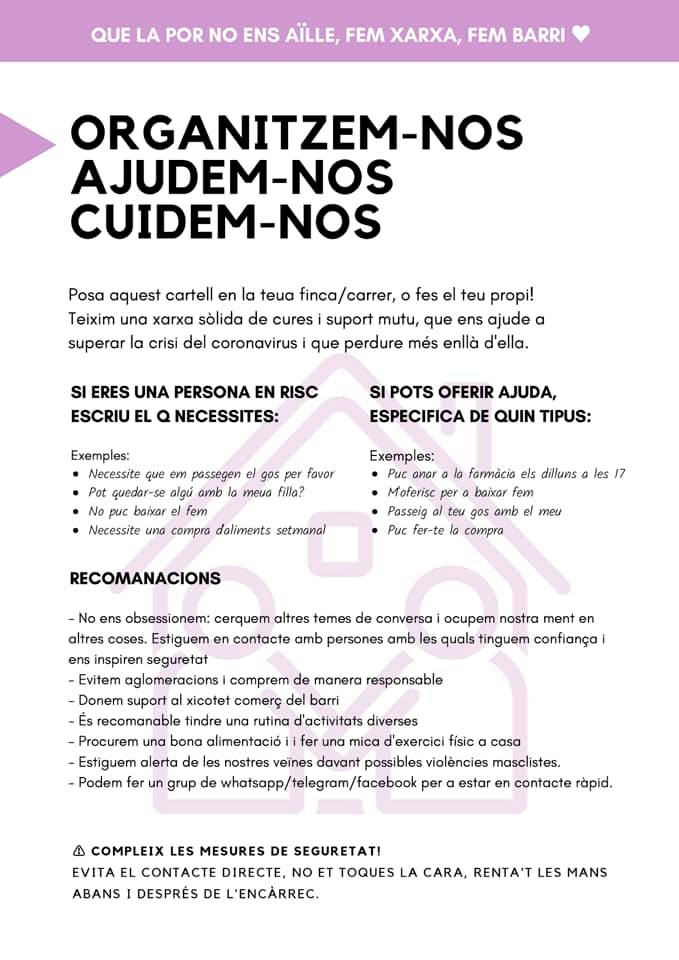 Es tracta d’un cartell/proposta per a fomentar el SUPORT MUTU VEÏNAL. Ja que tenim diverses necessitats i situacions pensem que el millor es fer XARXA de CURES entre totes