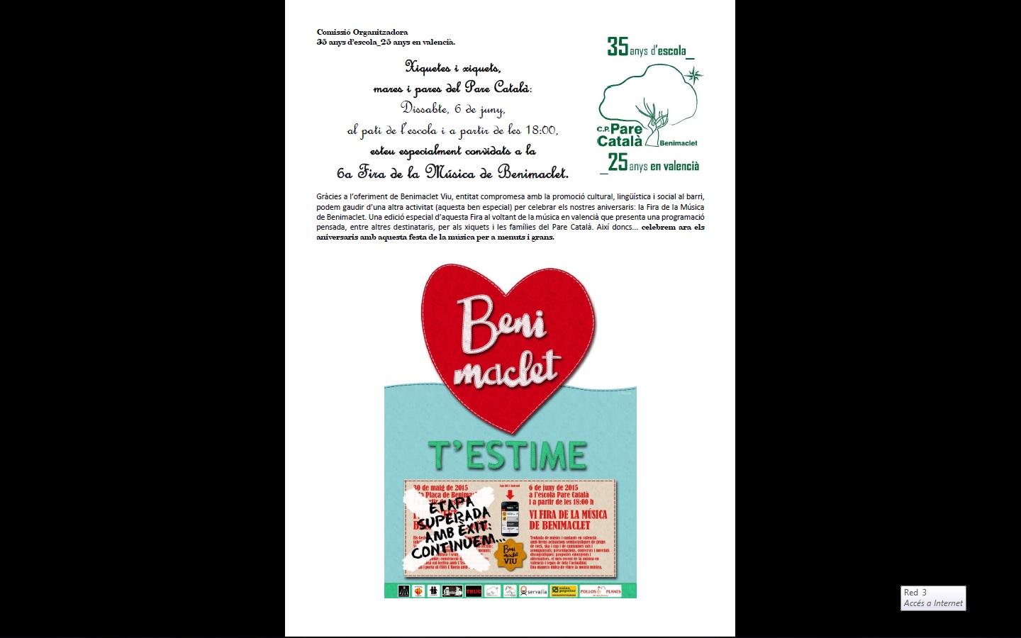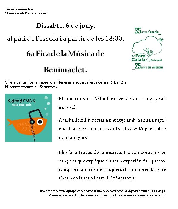 La Comissió Organitzadora de la commemoració 35 anys d’escola_25 anys en valencià té el plaer d’informar-vos que el Pare Català acull el pròxim dissabte 6 de juny al pati de l’escola a partir de les 18:00 hores la 6a Fira de la Música de Benimaclet, activitat organitzada per Benimaclet Viu dins les activitats del Benimaclet T’Estime.