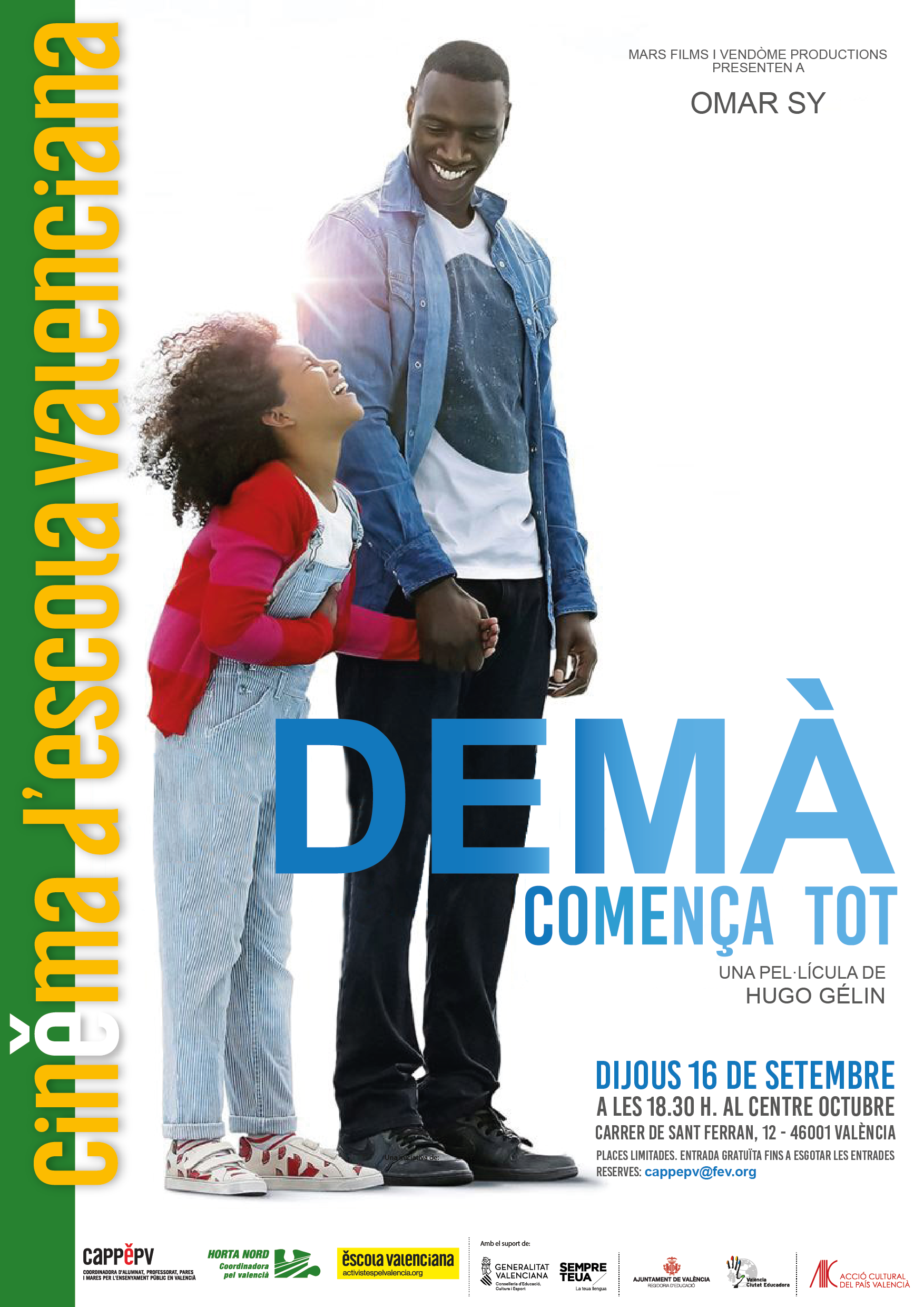 La CAPPEPV (Coordinadora d’Alumnes, Professorat, Pares i Mares per l’Ensenyament Públic en Valencià), La Coordinadora de l’Horta Nord i Escola Valenciana amb la col·laboració d’Acció Cultural, et convidem el dijous 16 de setembre a les 18:30h. a la projecció de la pel·lícula Demà comença tot al Centre Octubre, situat en el Carrer de Sant Ferran, 12, 46001 València